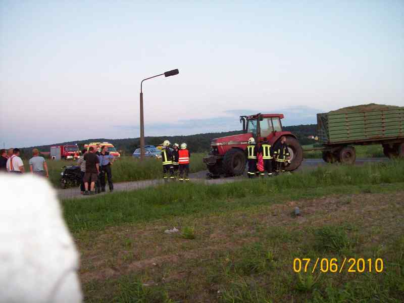 Zu einem schweren Verkehrsunfall wurden die Freiwilligen Feuerwehren Großkmehlen und Ortrand gerufen. Ein Motorradfahrer mizt Sozius wollte einen Traktor überholen als plötzlich die Landmaschine in eine Stallanlage abbog. Durch den Aufprall wurde der Motorradfahrer und Sozius schwer verletz und mussten in die Uniklinik nach Dresden geflogen werden.